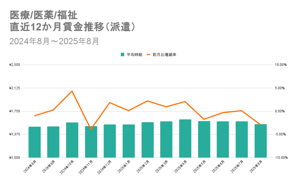 「建設/土木/エネルギー」では、株式会社ケイ・マックスが時給2,333円の求人を2024年12月と2025年7月に大量出稿。特に2024年12月には600件を超える出稿があり、これにより平均時給が大きく上昇しました。出稿が減少した後は、平均時給も減少しています。2025年4月から2025年7月にかけては上昇傾向を見せていたものの、2025年8月にかけては減少に転じています。