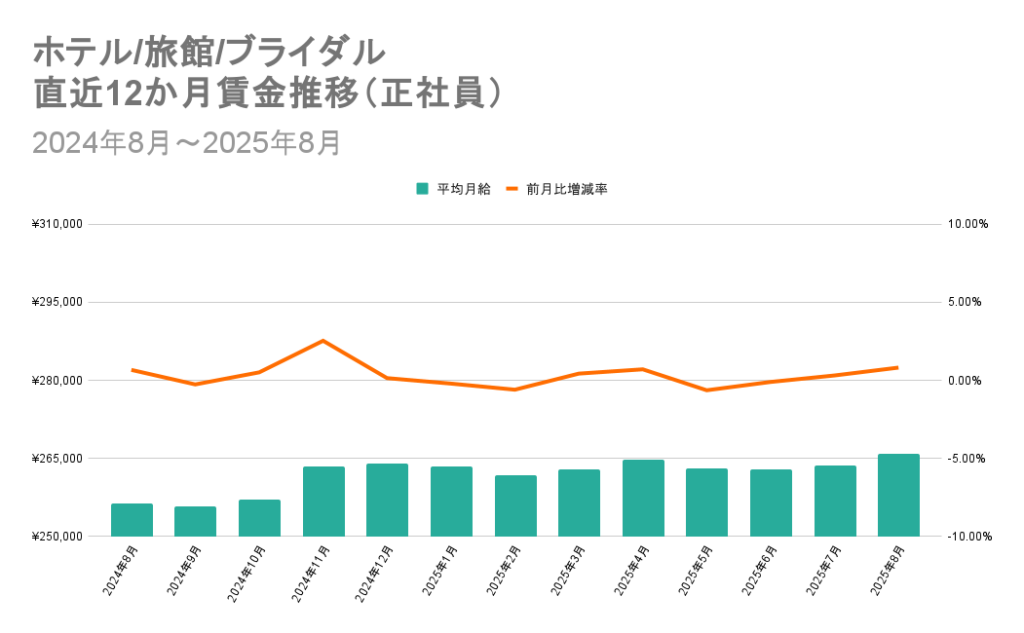 1位の「ホテル/旅館/ブライダル」と17位の「クリエイティブ(Web以外)」における直近の月給推移を比較すると、「ホテル/旅館/ブライダル」では、2024年10月から11月にかけて平均月給が大きく上昇し、その後は比較的安定した推移を続けています。