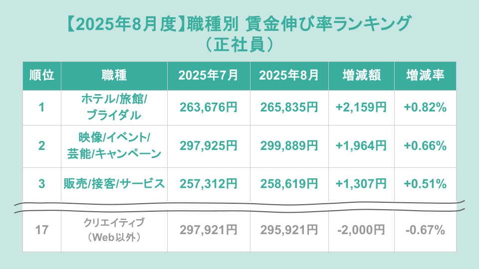 正社員の職種別賃金伸び率ランキング(前月比)トップ3は、1位が「ホテル/旅館/ブライダル」(増加額+2,159円、増加率+0.82%)、2位が「映像/イベント/芸能/キャンペーン」(増加額+1,964円、増加率+0.66%)、3位が「販売/接客/サービス」(増加額+1,307円、増加率+0.51%)でした。