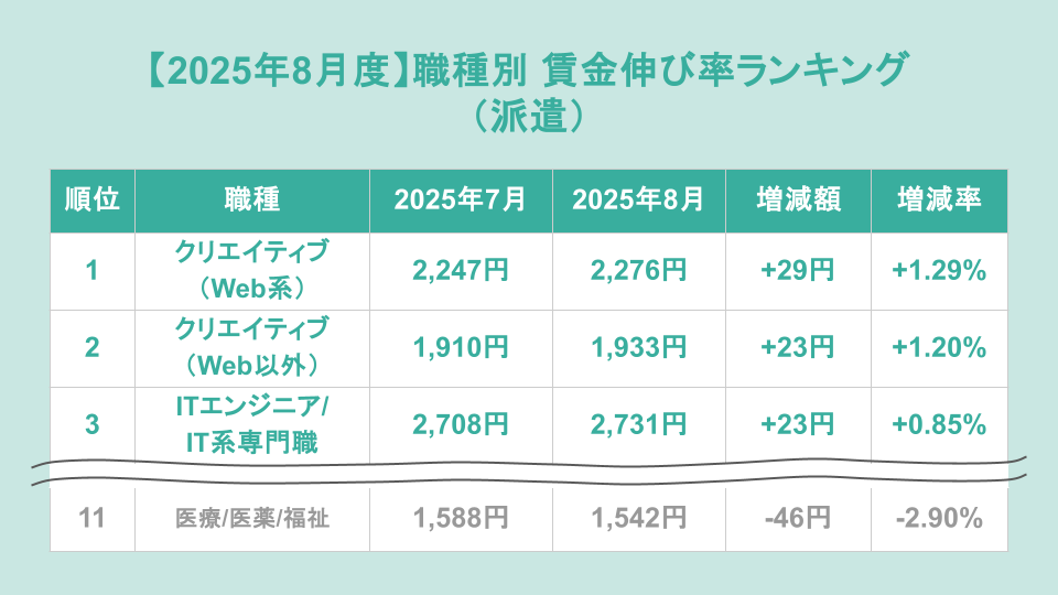 派遣の職種別賃金伸び率ランキング(前月比)トップ3は、1位が「クリエイティブ(Web系)」(増加額+29円、増加率+1.29%)、2位が「クリエイティブ(Web以外)」(増加額+23円、増加率+1.20%)、3位が「ITエンジニア/IT系専門職」(増加額+23円、増加率+0.85%)でした。