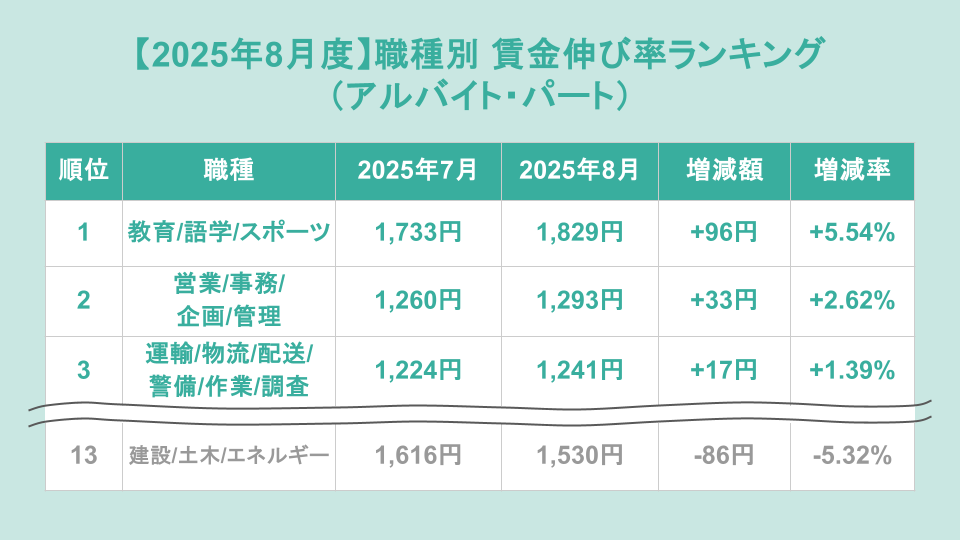 アルバイト・パートの職種別賃金伸び率ランキング(前月比)トップ3は、1位が「教育/語学/スポーツ」(増加額+96円、増加率+5.54%)、2位が「営業/事務/企画/管理」(増加額+33円、増加率+2.62%)、3位が「運輸/物流/配送/警備/作業/調査」(増加額+17円、増加率+1.39%)でした。