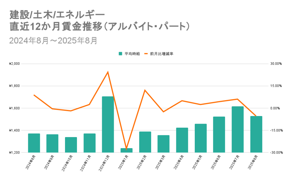 1位の「教育/語学/スポーツ」と13位の「建設/土木/エネルギー」における直近12か月の賃金推移を比較すると、「教育/語学/スポーツ」では、2024年8月に平均時給が1,954円と高い水準に達した後、2024年9月には急落。受験シーズンに合わせて集中的に出稿していた特定の教育系企業の高時給求人の掲載終了が影響しました。以後は横ばいでの推移を見せていたものの、受験シーズンに合わせて再び平均時給が上昇しました。