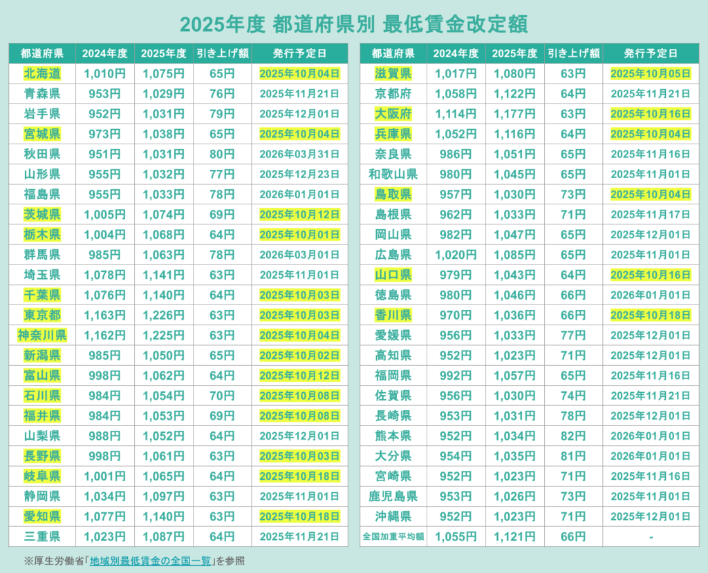 ※最低賃金の改定については厚生労働省「地域別最低賃金の全国一覧」を参照