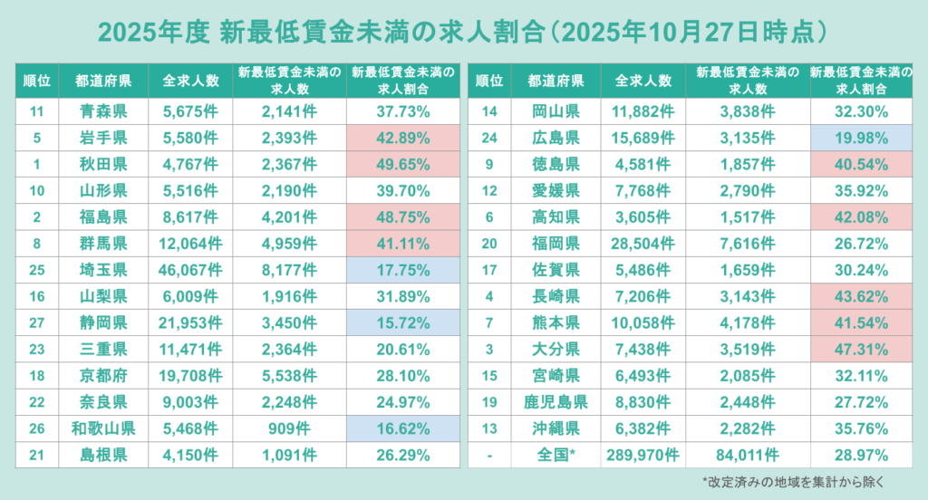 【2025年10月度】改定後の最低賃金に満たない求人割合は?全国では28.97%で前月比17.41ポイント改善