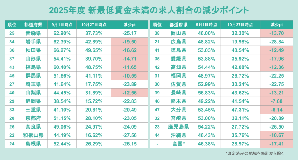 • 改定済みの地域を除き、2025年度の改定後最低賃金に満たない求人は全国で28.97%となり、9月時点(46.38%)から17.41pt改善。改定の反映が全国的に進んでいることが明らかに