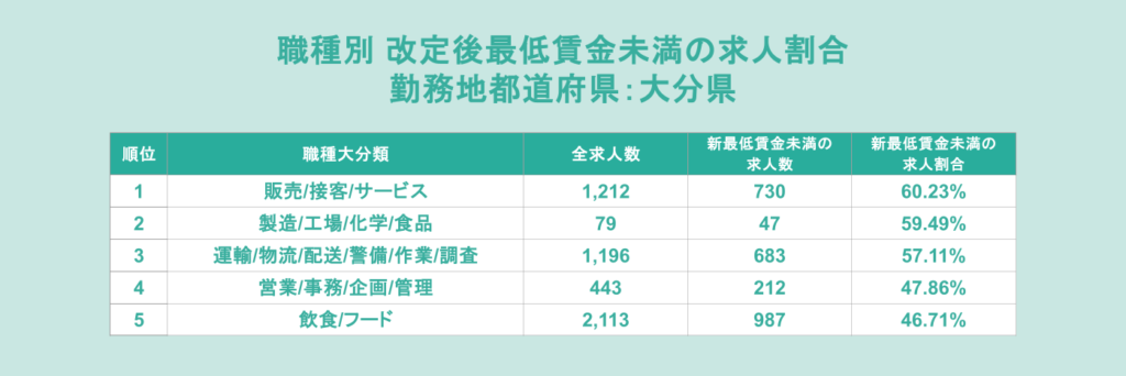 最後に3位の大分県では、「販売/接客/サービス」が60.23%で最大となりました。続いて「製造/工場/化学/食品」が59.49%、「運輸/物流/配送/警備/作業/調査」が57.11%と続いています。