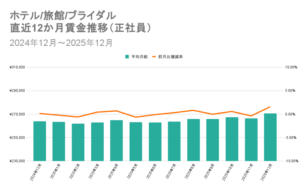 1位の「ホテル/旅館/ブライダル」と17位の「建設/土木/エネルギー」における直近の月給推移を比較すると、「ホテル/旅館/ブライダル」では2024年12月の263,921円から2025年2月には261,801円まで減少しましたが、その後は緩やかな上昇と下落を繰り返しながら推移。
