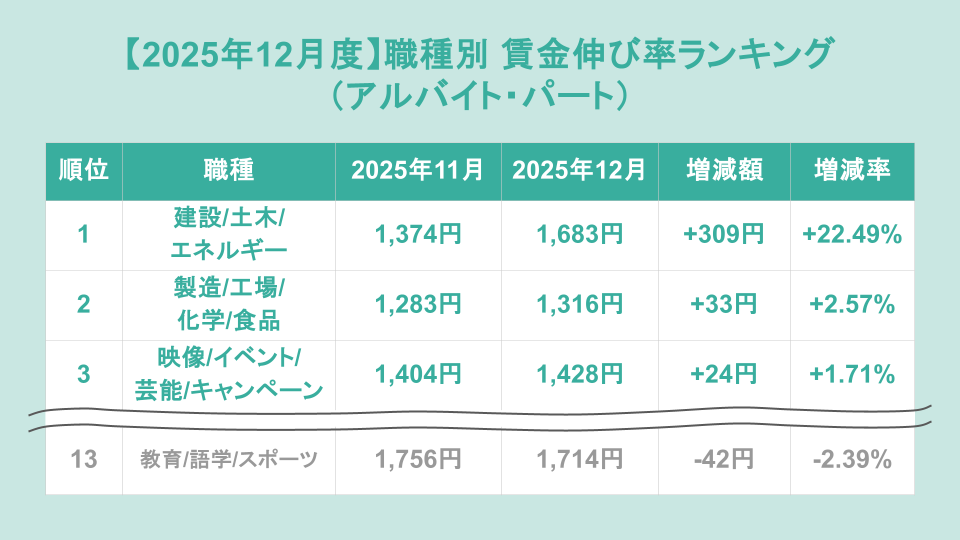 アルバイト・パートの職種別賃金伸び率ランキング(前月比)トップ3は、1位が「建設/土木/エネルギー」(増加額+309円、増加率+22.49%)、2位が「製造/工場/化学/食品」(増加額+33円、増加率+2.57%)、3位が「映像/イベント/芸能/キャンペーン」(増加額+24円、増加率+1.71%)でした。