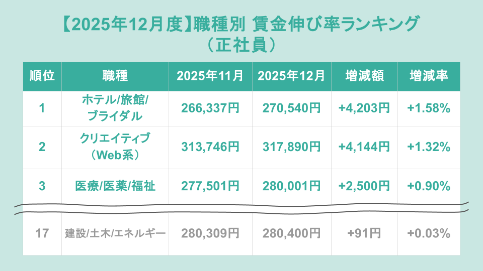 正社員の職種別賃金伸び率ランキング(前月比)トップ3は、1位が「ホテル/旅館/ブライダル」(増加額+4,203円、増加率+1.58%)、2位が「クリエイティブ(Web系)」(増加額+4,144円、増加率+1.32%)、3位が「医療/医薬/福祉」(増加額+2,500円、増加率+0.90%)でした。