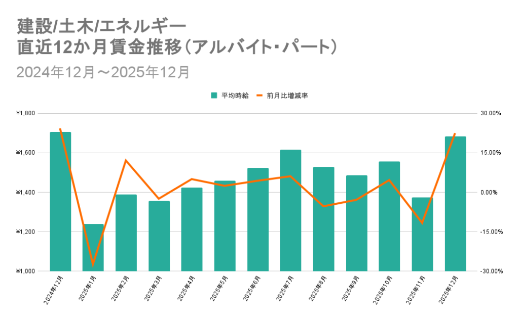1位の「建設/土木/エネルギー」と13位の「教育/語学/スポーツ」における直近12か月の賃金推移を比較すると、「建設/土木/エネルギー」では特定の企業が時給2,000円以上の資材搬入系の求人を複数出稿した影響で、平均時給が急上昇しました。