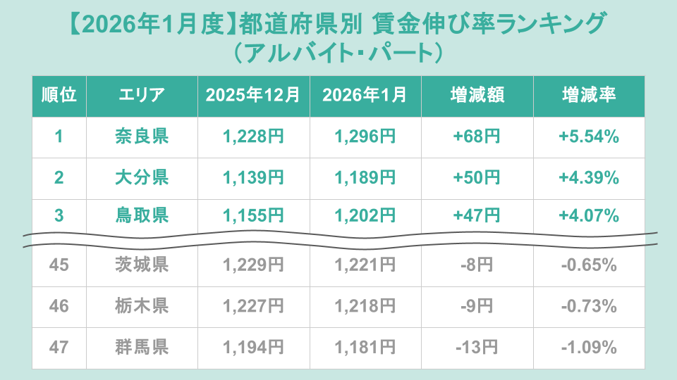 アルバイト・パートの都道府県別賃金伸び率ランキング(前月比)トップ3は、1位が奈良県(増加額+68円、増加率+5.54%)、2位が大分県(増加額+50円、増加率+4.39%)、3位が鳥取県(増加額+47円、増加率+4.07%)でした。