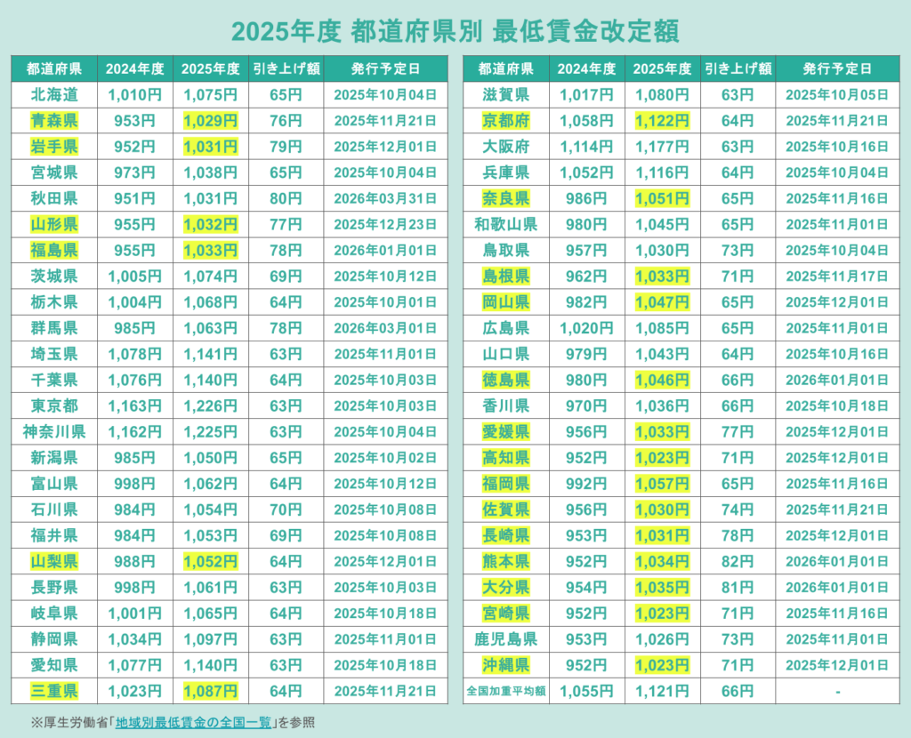 ※最低賃金の改定については厚生労働省「地域別最低賃金の全国一覧」を参照