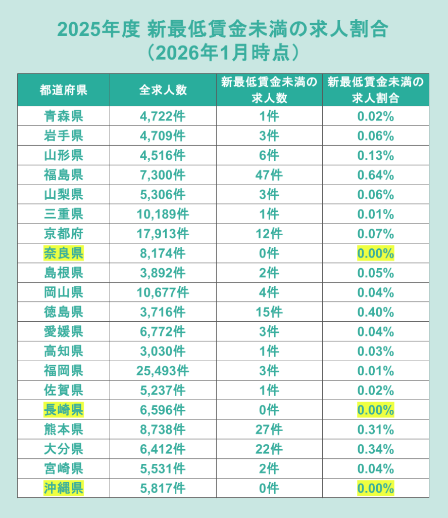 一方で、2026年1月1日に改定を行った熊本県、大分県、福島県、徳島県では相対的に最低賃金未満の求人割合が高く、改定直後の調整が続いている様子もうかがえました。