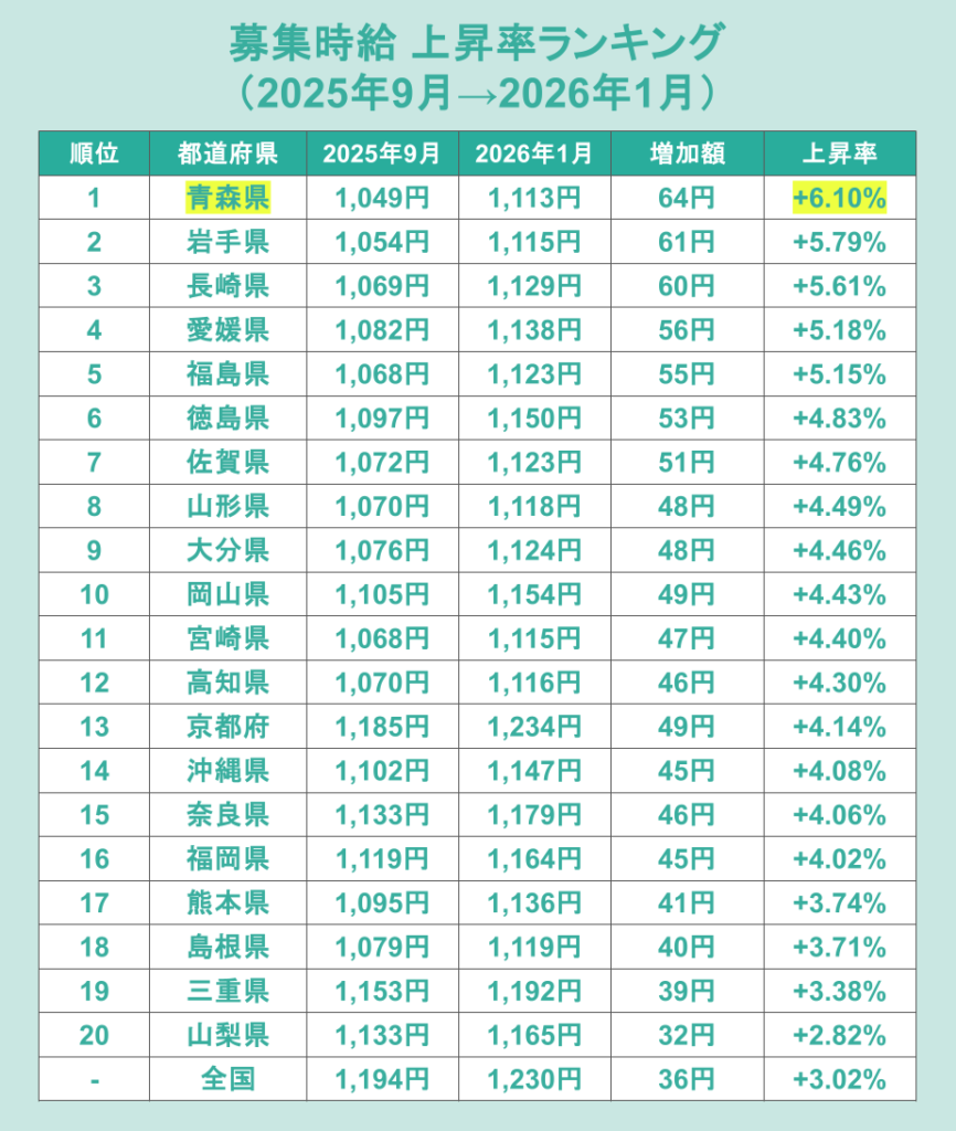 まず、最低賃金改定前後となる2025年9月から2026年1月にかけての募集時給の上昇状況を都道府県別に見てみます。上昇率ランキングでは、青森県が+6.10%で1位となり、次いで岩手県が+5.79%、長崎県が+5.61%と続きました。