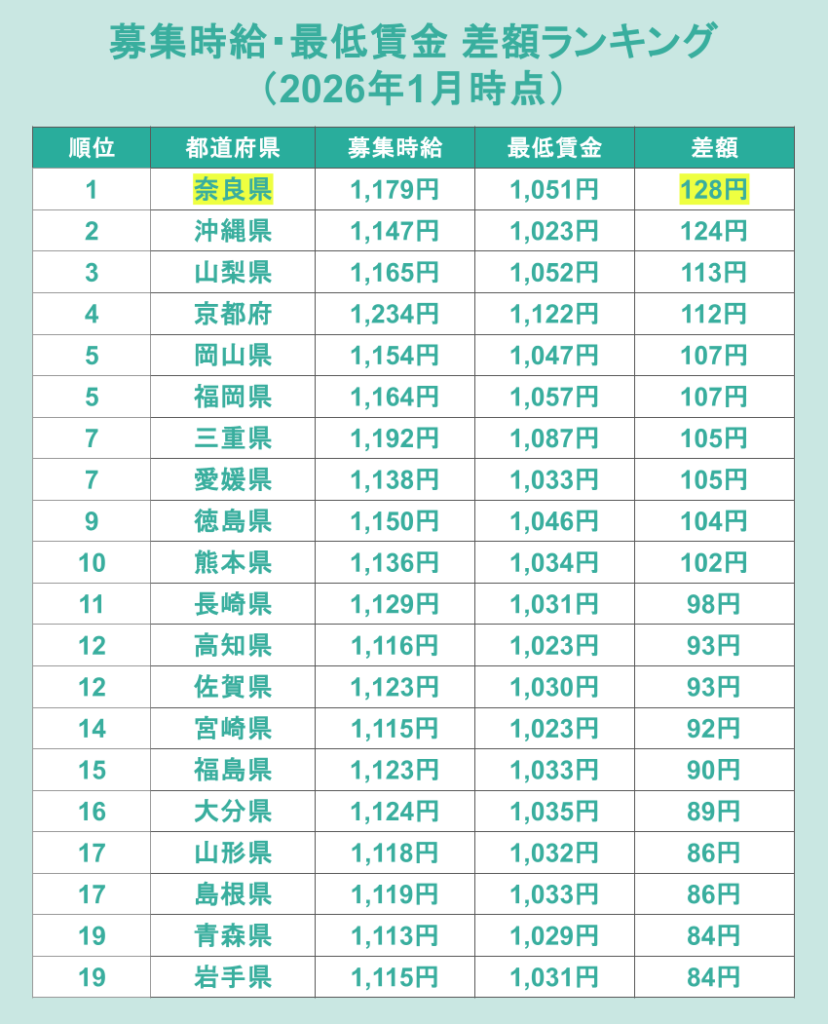 最後に2026年1月時点の募集時給が、新最低賃金に対してどのくらい上乗せされているかをランキングで分析します。対象自治体の中で最も差額が大きいのは奈良県で128円となり、次いで沖縄県が124円、山梨県が113円と続きました。