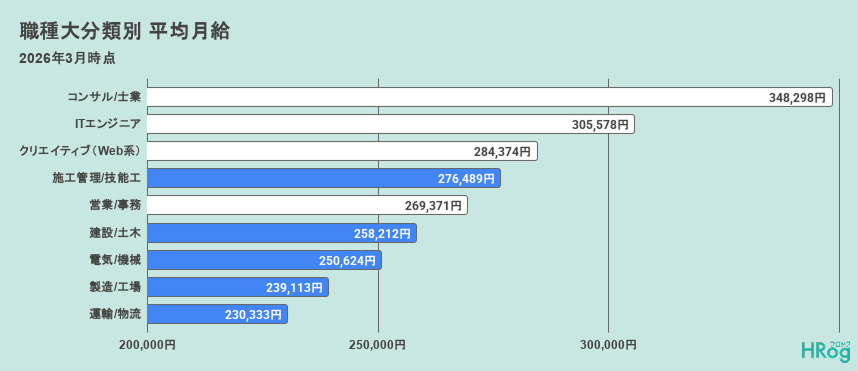 職種大分類とは、職種を大きく分類した区分です。職種大分類別に2026年3月2日時点の平均月給を確認すると、全体としてホワイトカラーの職種の方が平均月給が高く、1位は「コンサル/士業」です。他職種と比べ飛びぬけて高い水準で、月給は35万円近くに達します。