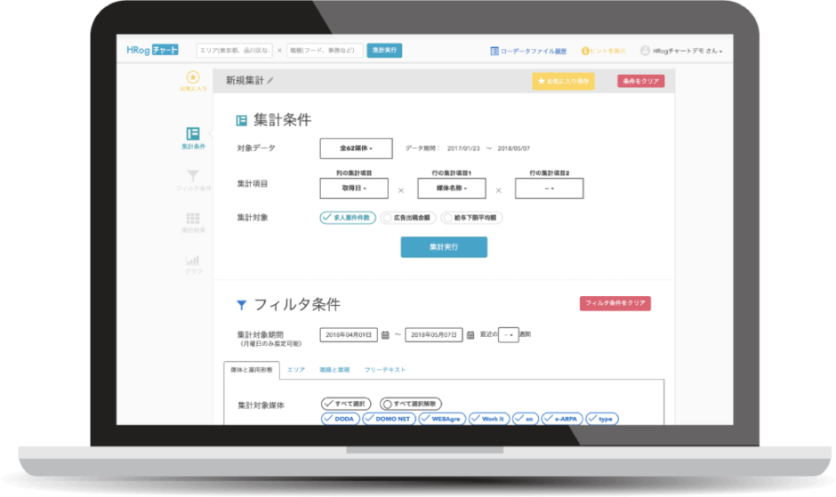 今回の調査で使用したように、「HRogチャート」では様々な求人媒体の求人データを横断して、媒体・地域・職種など様々な軸で集計できます。時給だけでなく、求人数や広告出稿金額なども調査することが可能です。