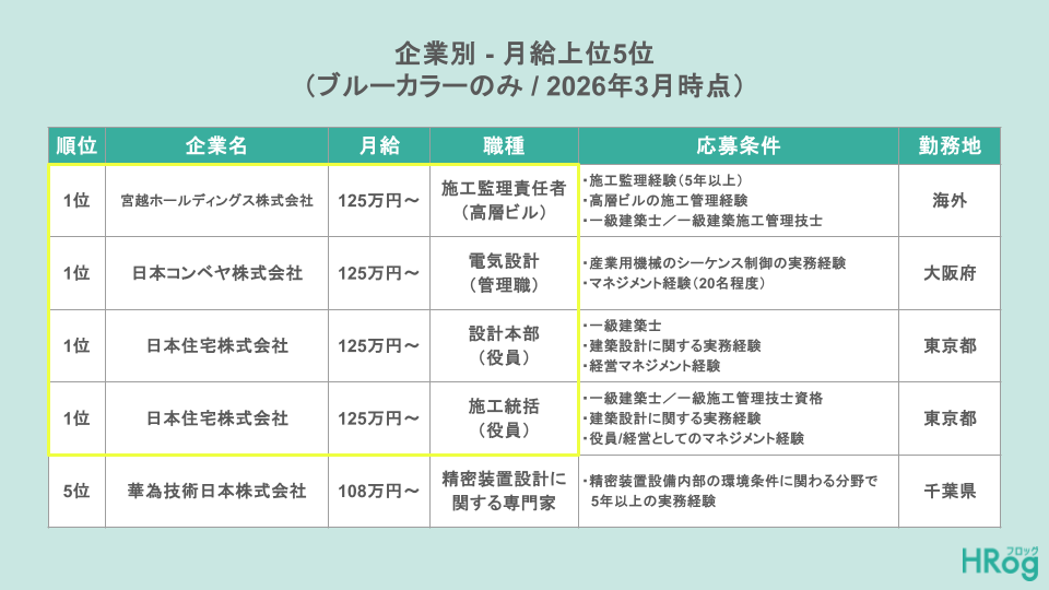 ブルーカラー職種における平均月給が高い企業のランキングを作成したところ、1位に月給125万円以上の企業が延べ3社ランクインしました。