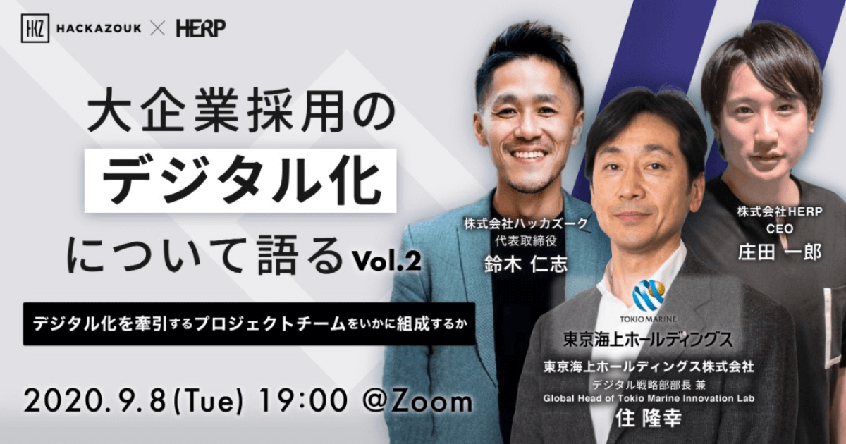 【9月8日開催】大企業採用のデジタル化について語る Vol.2 ~デジタル化を牽引するプロジェクトチームをいかに組成するか~、株式会社ハッカズーク・株式会社HERP