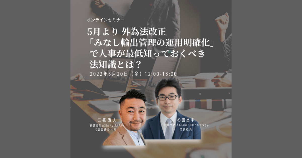 【5月20日開催】5月より外為法改正「みなし輸出管理の運用明確化」で人事が最低知っておくべき法知識とは?、株式会社ASIA to JAPAN主催