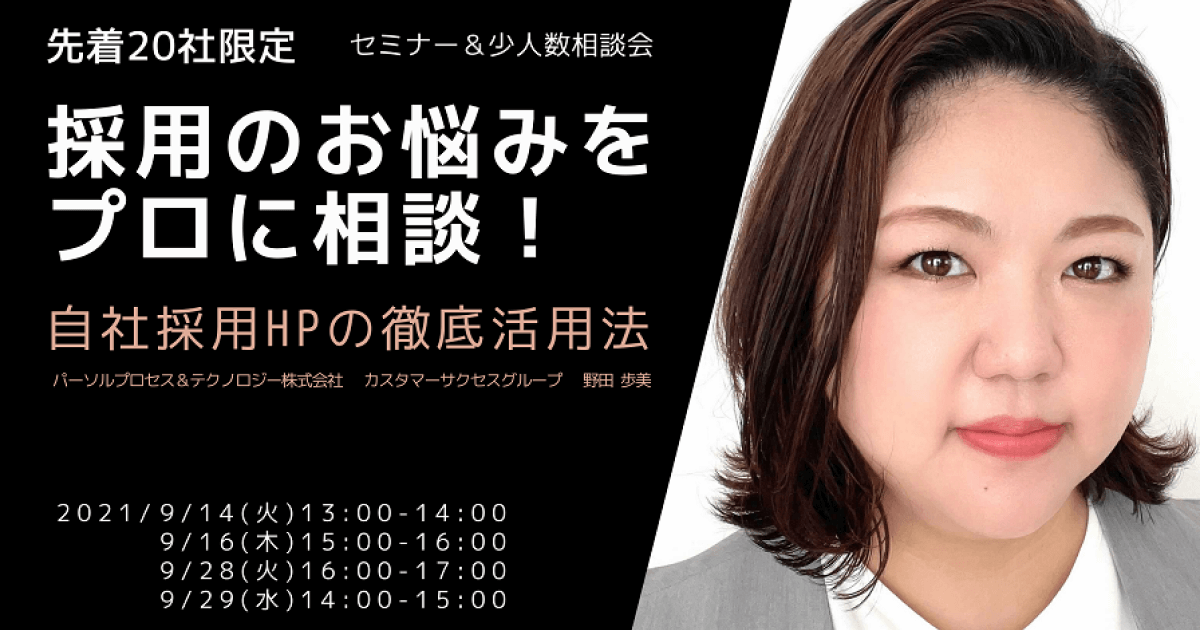 【9月14日より開催】採用のお悩みをプロに相談!自社採用HPの徹底活用法、パーソルプロセス&テクノロジー株式会社主催