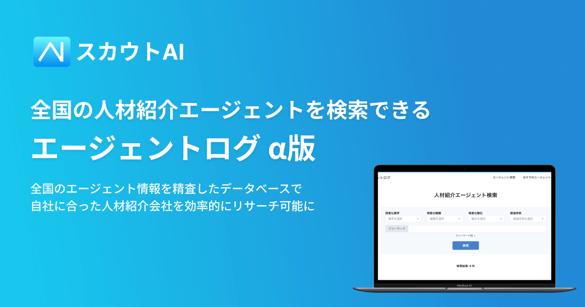 株式会社スカウトAI、全国の人材紹介エージェントを検索できる「エージェントログa版」をリリース