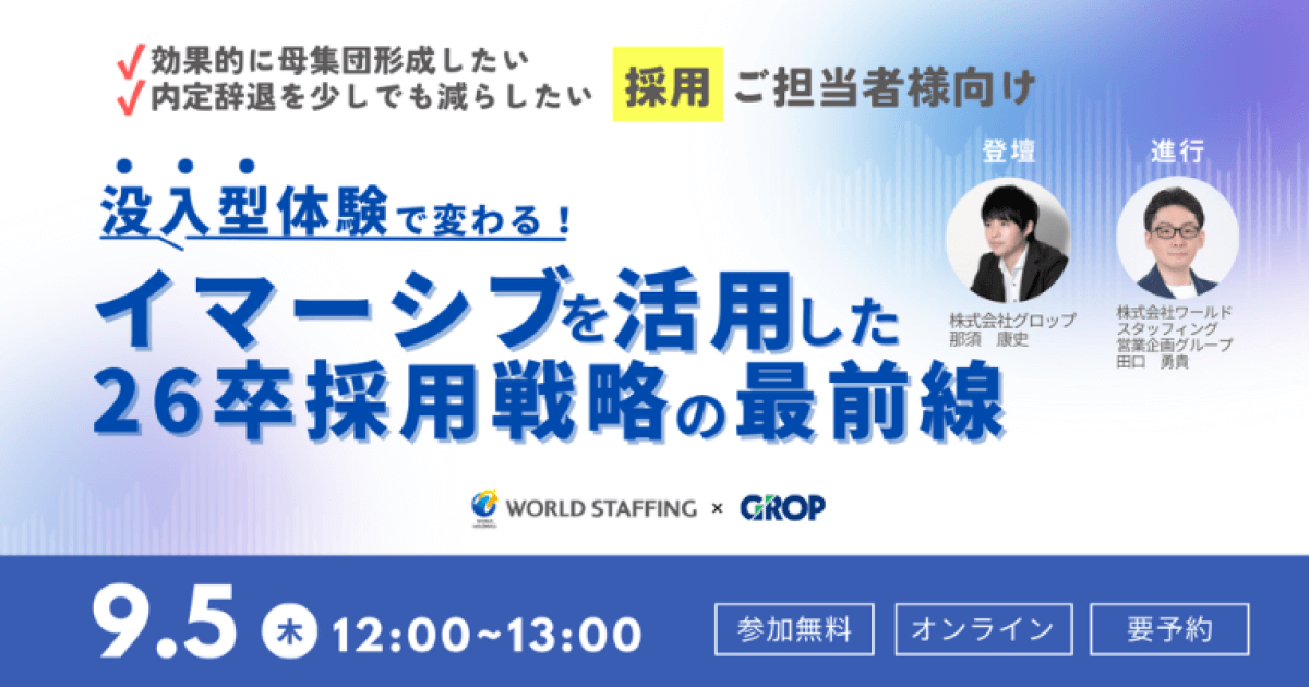 【9月5日開催】没入型体験で変わる!イマーシブ採用の最前線セミナー、株式会社ワールドスタッフィング主催