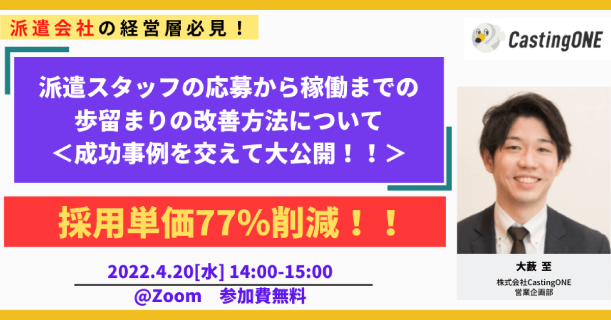 【4月20日開催】採用単価77%削減!派遣スタッフの応募から稼働までの歩留まりの改善方法について<成功事例を交えて大公開!!>、株式会社CastingONE主催