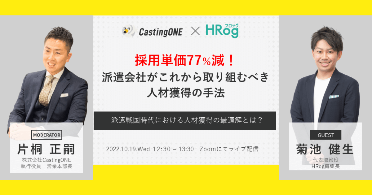【10月19日開催】採用単価77%減!派遣会社がこれから取り組むべき人材獲得の手法、株式会社CastingONE・株式会社フロッグ共催
