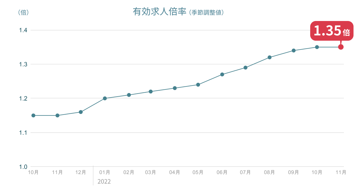 11月の有効求人倍率は1.28倍、前月から0.02ポイント低下