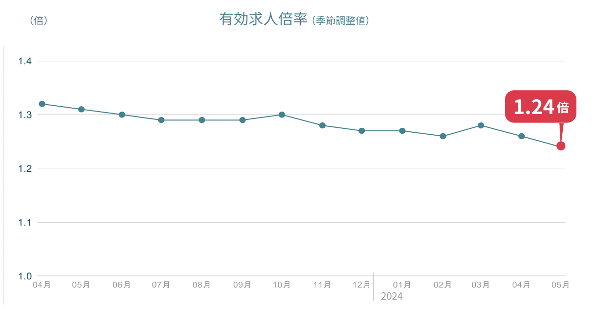 5月の有効求人倍率は1.24倍、前月から0.02ポイント低下。