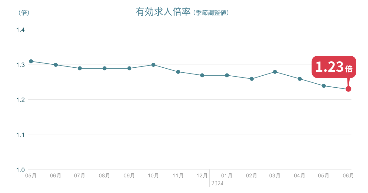 6月の有効求人倍率は1.23倍、前月から0.01ポイント低下。