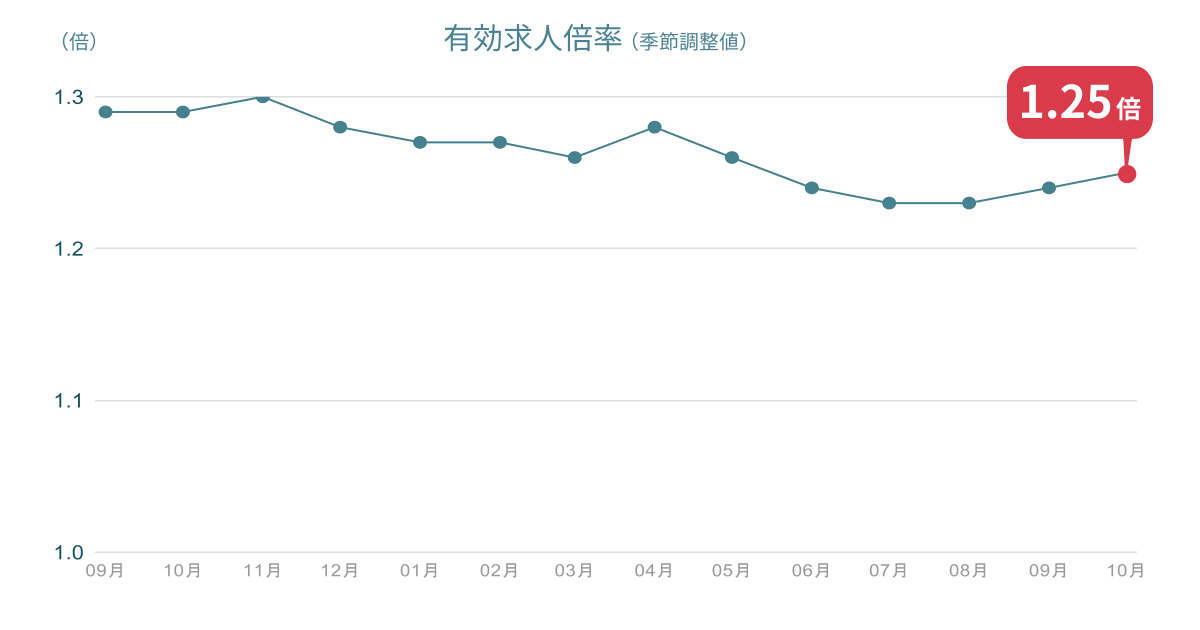 10月の有効求人倍率は1.25倍、前月から0.01ポイント上昇。