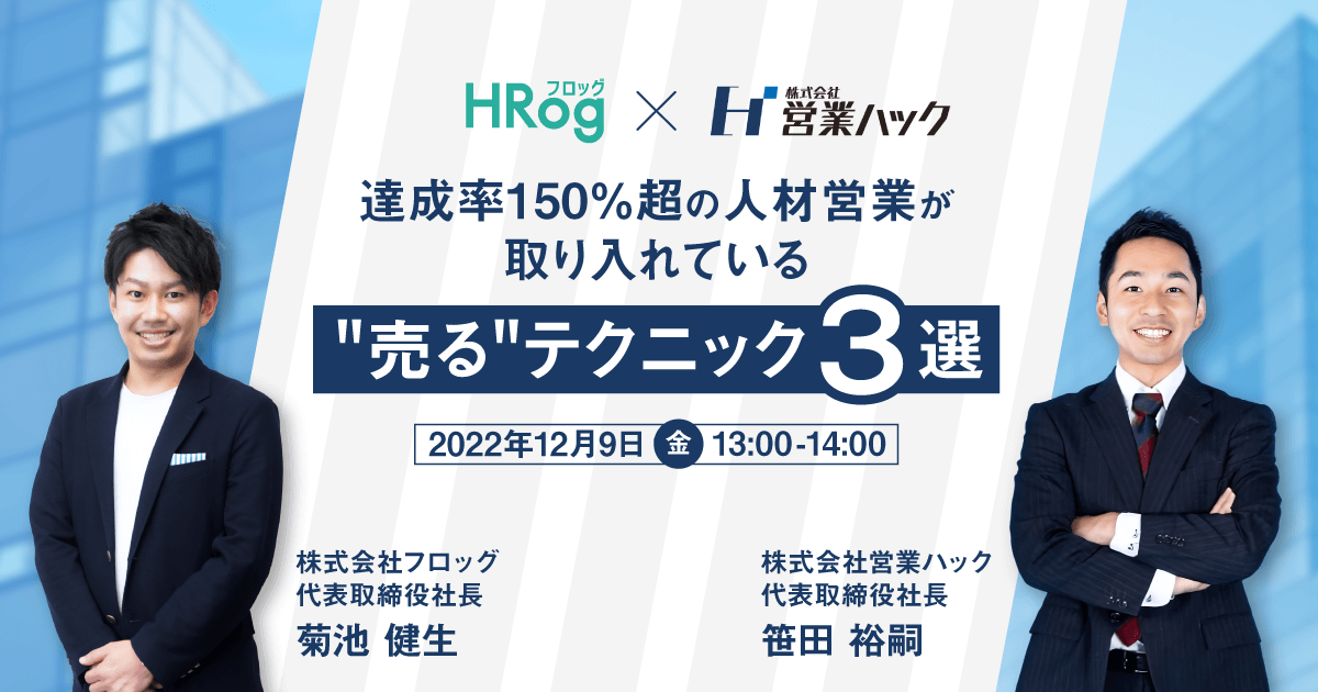 【12月9日開催】達成率150%超の人材営業が取り入れている”売る”テクニック3選、株式会社営業ハック・株式会社フロッグ共催