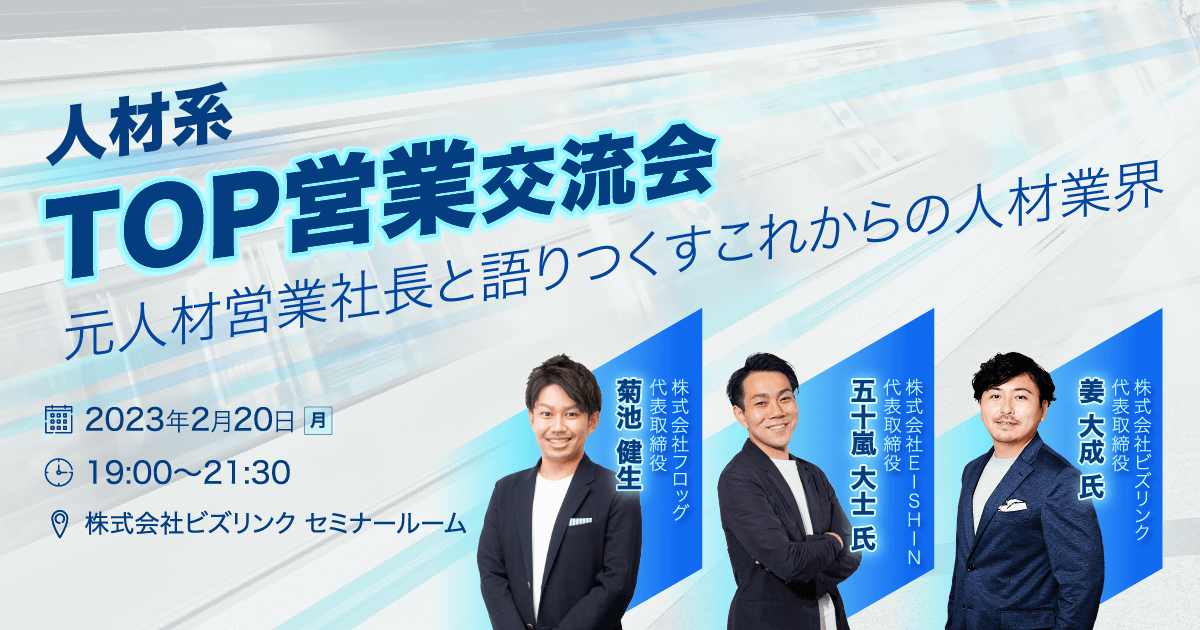 【2月20日開催】人材系TOP営業交流会 元人材営業社長と語りつくすこれからの人材業界、株式会社ビズリンク・株式会社EISHIN・株式会社フロッグ共催
