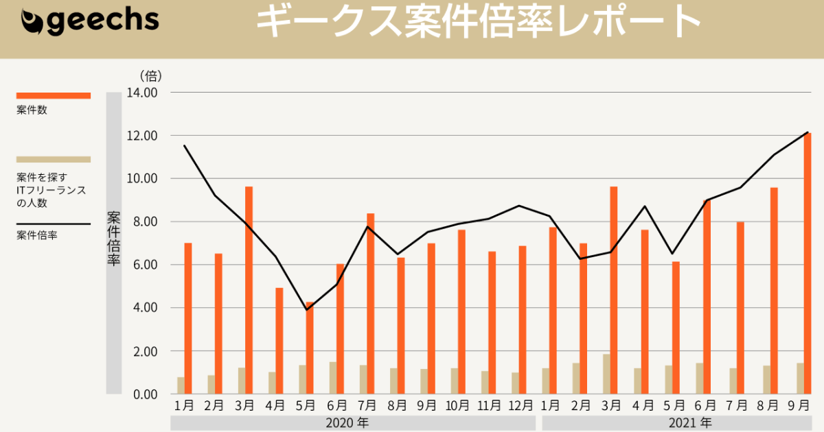 9月のITフリーランス案件倍率は過去最大の12.13倍、ギークス株式会社レポート