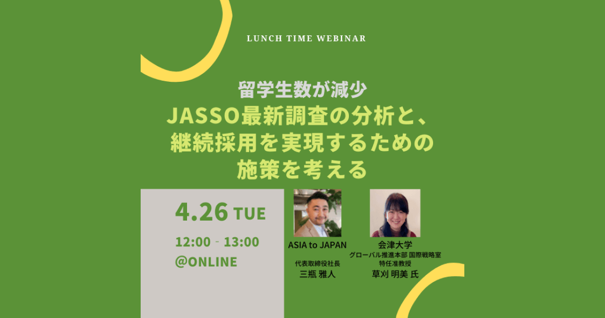 【4月26日開催】留学生数が減少。JASSO最新調査の分析と、継続採用を実現するための施策を考える、株式会社ASIA to JAPAN主催