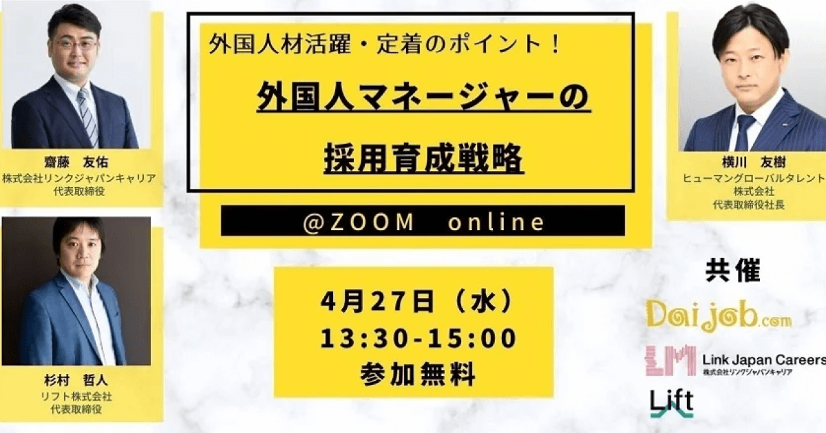 【4月27日開催】外国人材活躍・定着のポイント!外国人マネージャーの採用育成戦略、株式会社リンクジャパンキャリア・リフト株式会社・ヒューマングローバルタレント株式会社共催