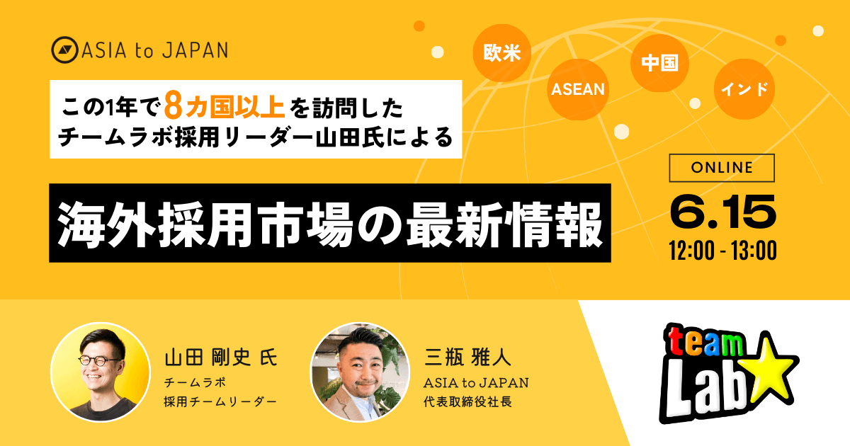 【6月15日開催】この1年で8カ国以上を訪問した チームラボ採用リーダー山田氏による海外採用市場の最新情報、株式会社ASIA to JAPAN主催